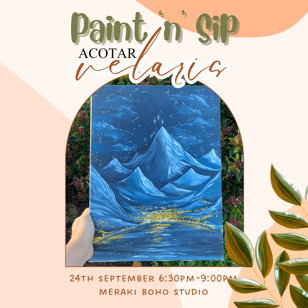 Join me for a magical ACOTAR-themed Paint ‘n’ Sip where we’ll recreate the breathtaking City of Starlight. With a drink in hand and paintbrush at the ready, you’ll be guided step-by-step to create your own shimmering mountain skyline under a galaxy of stars. Perfect for fans of the series or anyone who loves a little fantasy mixed with creativity.!